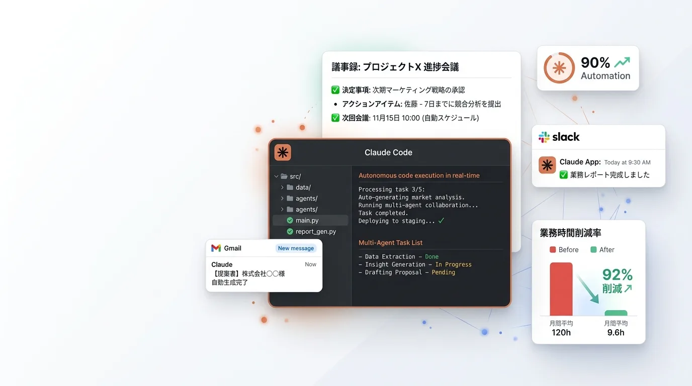 上記はほんの一例。議事録・経費精算・人事評価・採用業務・カスタマーサポートなど、あらゆるホワイトカラー業務に適用可能です。